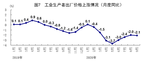 前三季度,全国工业生产者出厂价格同比下降2.0%;其中9月份同比下降2.1%,环比上涨0.1%。前三季度,全国工业生产者购进价格同比下降2.6%;其中9月份同比下降2.3%,环比上涨0.4%