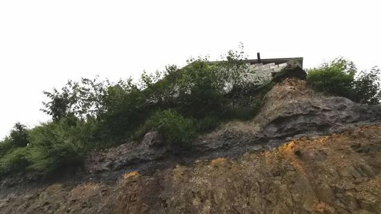 村口,一座被拆掉一半的二层小楼竖在路边,楼侧边形成几米高的深坑,坡面长满了杂草、乔木。