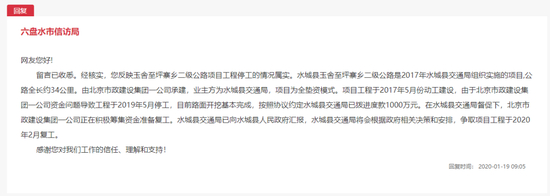 2020年1月,李冰等在人民网《领导留言板》反映相关问题,六盘水市信访局回复称,该项目为全垫资模式,北京市政一公司资金问题导致工程停工。在县交通局督促下,北京市政一公司正在积极筹集资金准备复工。县交通局将会根据政府相关决策和安排,争取项目工程于2020年2月复工。