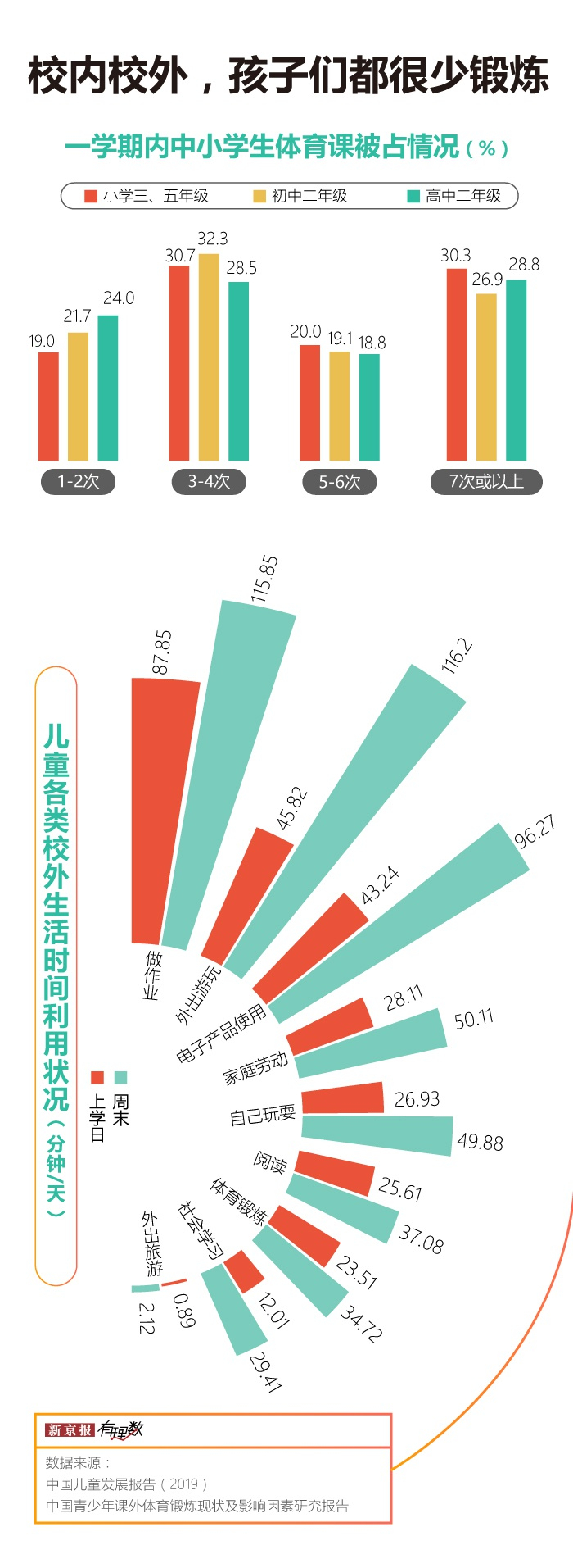 在校外,孩子们也没把多少时间放在体育锻炼上。据《中国儿童发展报告(2019)》,中国儿童上学日校外平均每天体育锻炼时间为23.5分钟,周末校外平均每天体育锻炼时间为34.7分钟,明显低于做作业和使用电子产品等静态活动的时间。
