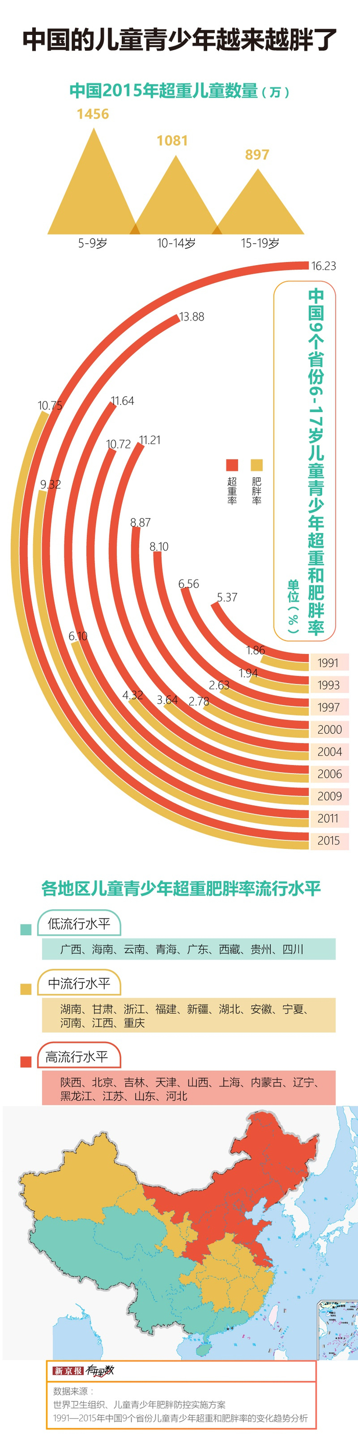 按照WHO的标准,中国9个省份(黑龙江、辽宁、山东、河南、江苏、湖北、湖南、广西和贵州)6-17岁儿童青少年的超重率已由1991年的5.37%增长至2015年的16.23%,肥胖率由1991年的1.86%增长至2015年的10.75%。