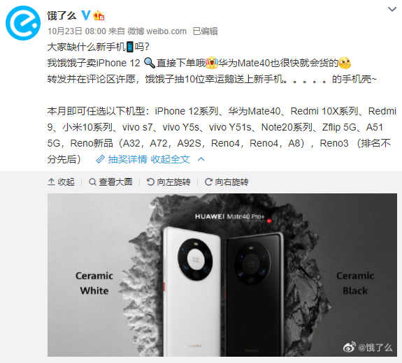 我饿饿子卖 iPhone 12,华为 Mate 40 也很快就会有货的。