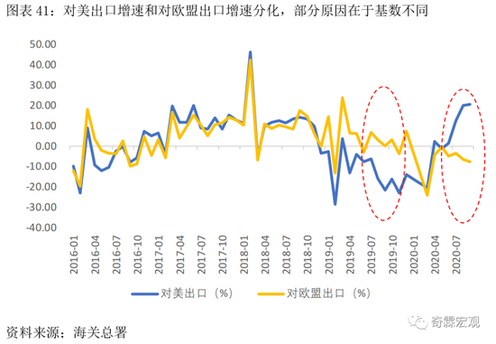 对美出口快速上行,部分原因在于上年同期基数走低。而对欧盟出口同比回落,可能和9月欧洲疫情再起、防疫措施趋严导致经济修复放缓有关。