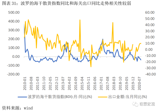 逻辑上是如此,但是比较遗憾的是,从短期来看BDI月同比对我国出口同比变动方向的预测成功率,只有50%左右。所以它只能是作为判断全球经济景气度的一个简易指标,不是很适合直接用于预测出口。