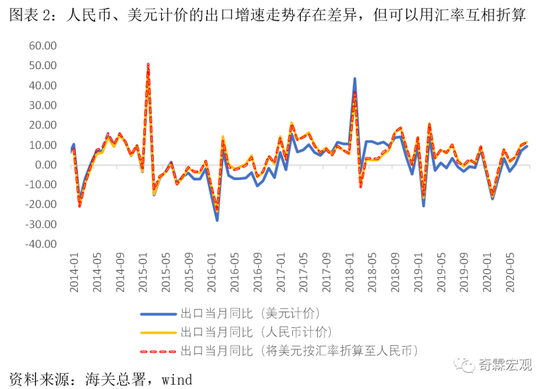不过,美元计价和人民币计价数据,其实很容易换算。用美元计价的出口同比+上个月美元兑人民币平均汇率的同比,可以很好地拟合人民币计价的出口同比。