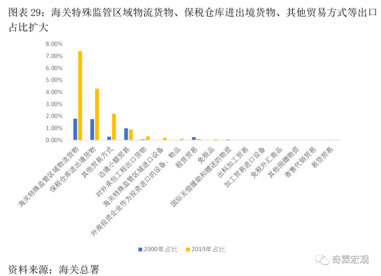 对比2000年和2019年,占比扩大较快的主要是“海关特殊监管区域物流货物”、“保税仓库进出境货物”,还有“其他贸易方式”(包括市场采购货物、边民互市进出口商品及通过邮件、B类快件渠道进出境的跨境电商包裹等)。