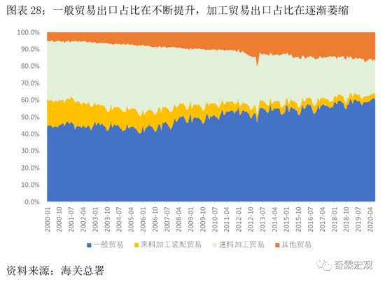 目前,一般贸易、进料加工贸易占比分别为60%、20%左右,而来料加工装配贸易占比已经不到5%。