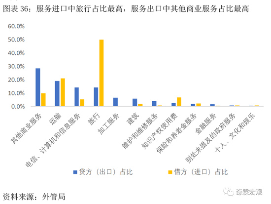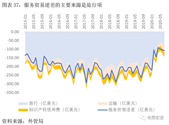 其中,进口中最主要的分项是“旅行”,2015年至今占比平均为52%,不过2020年受疫情影响,目前已快速滑落至30%左右。
