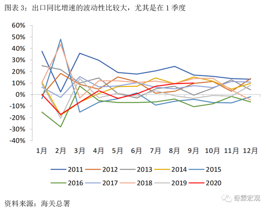 观察出口和进口的当月同比增速,可以发现它们都有很明显的波动性,尤其是在一季度。