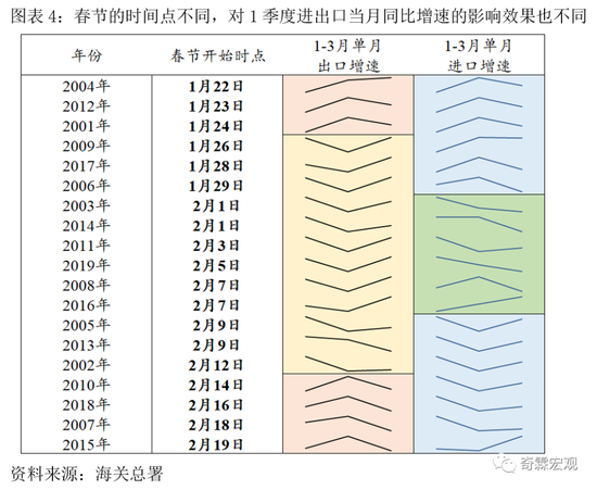 下图按照春节假期的先后顺序,对进出口在2001-2020年的1-3月单月增速规律进行了简单的归纳。