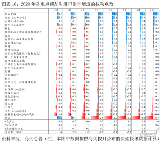 一是集成电路和自动数据处理设备及其零部件,和电子信息产业链有关。尤其是集成电路,对进口增速的拉动作用在9月明显提升,这也可能和中国科技企业为了预防美国进一步制裁,加快零部件备货有关。