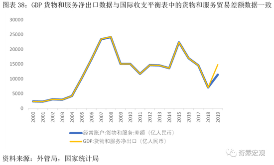与此同时,GDP支出项下,有年度的净出口数据,它直接取自国际收支平衡表(人民币计价)中的“经常账户-贸易与服务项-差额”。