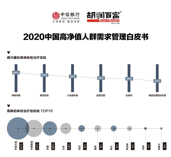 高净值人群对高端体检项目表现出较强兴趣。肿瘤筛查(66%)是高净值人群最感兴趣的体检项目,其次是基因检测(59%)。在青睐的体检目的地中,中国大陆最受欢迎,占67%,其次为中国香港(41%)。