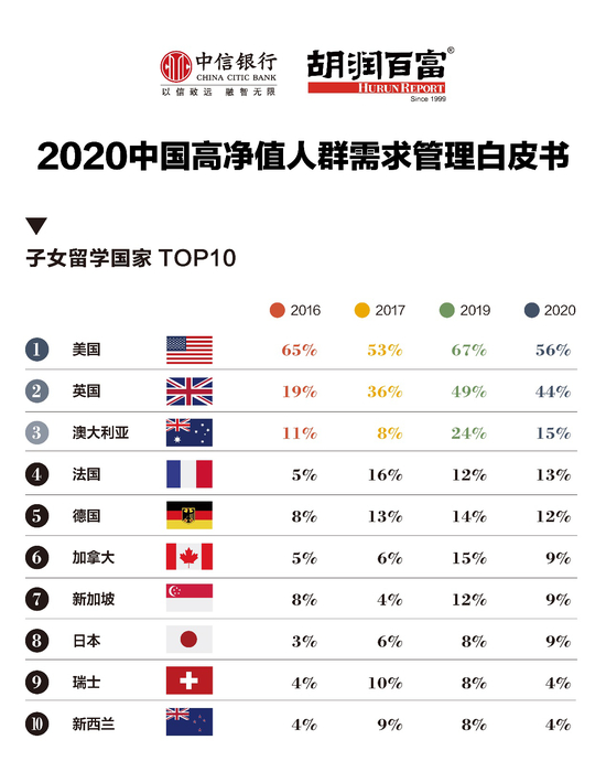 美国(56%)、英国(44%)仍然是中国高净值家庭首选的留学国家,加拿大吸引力在下降。专业选择上,最青睐商科(58%),其次是数学/计算机专业(31%)。