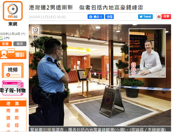环球网援引“东网”11月14日报道,14日凌晨零时许,一名钱姓及一名方姓男子离开湾仔港湾道会展皇朝会时,被3至4名男子用刀袭击,事主躲避不及受伤,凶徒得逞后逃走。其中方姓男子跑至一旁躲避,钱姓伤者受伤后登上前来接载2人的车辆,返回南区香岛道一豪宅报警求助。报道引述消息称,2名遇袭伤者,其中一人为内地富豪钱峰雷,警方正调查歹徒作案动机。