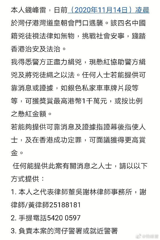 微博中表示,任何人士若能提供可靠消息或证据,如银色私家车车牌片段等等,可获奖赏最高港币一千万元,或按比例之悬红金额。
