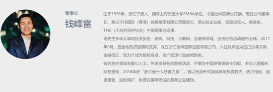 据浙江恒峰国际控股有限公司官网,钱峰雷生于1976年,浙江宁波人,拥有上海交通大学EMBA学位,中国社科院博士在读,现任公司董事长,兼任环球国际(香港)控股集团有限公司董事长,系知名企业家、资深投资人、慈善家、TNC(大自然保护协会)中国理事会理事。