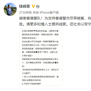 内地富商钱峰雷悬赏千万港元寻找线索 支持香港警方早日破案