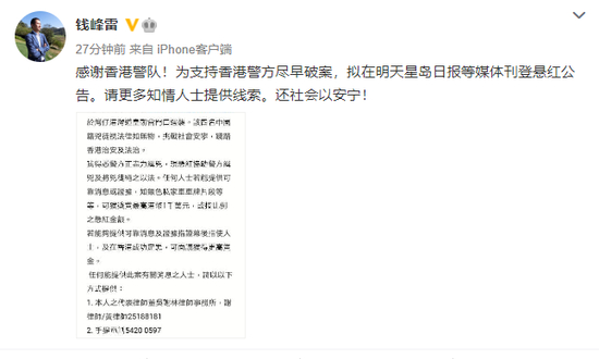 钱峰雷15日晚间发布微博称,感谢香港警队!为支持香港警方尽早破案,拟在明天星岛日报等媒体刊登悬红公告。请更多知情人士提供线索。还社会以安宁!