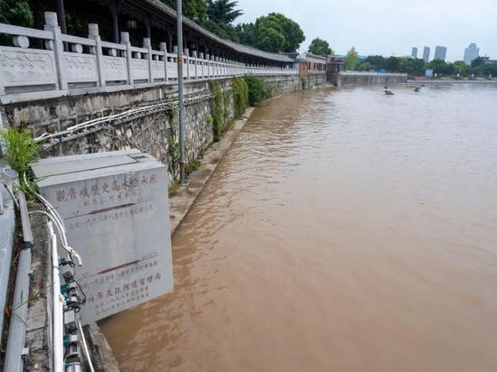 ▲ 荆江大堤上标注有1998年最高洪水位的水泥柱