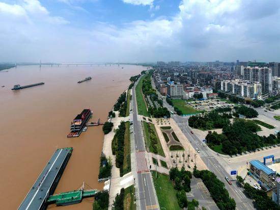 调蓄后的洪水蜿蜒而下,路过荆江,却不再激起千层浪。从李斌的店内向外望去,此时的荆江上,大型船舶往来穿行,平稳如常;老百姓漫步在大堤上,丝毫不受汛情影响。