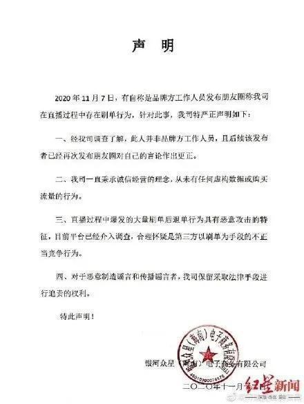 对此,汪涵签约方银河众星回应称“这是假的”,公司没有任何虚构数据或购买流量的行为,只是帮该电商平台账号做一次直播执行,没有必要去刷单,这次刷单后退单具有恶意攻击特征。目前平台方正在介入调查,具体攻击源头还未查清。