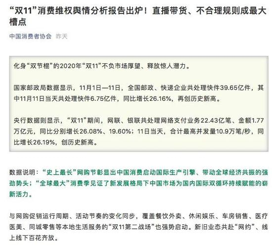 基于对10月20日—11月15日期间相关消费维权情况的网络大数据舆情分析,中国消费者协会微信公众号昨日发布《“双11”消费维权舆情分析报告》(以下简称“《报告》”)。