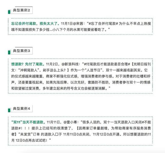 二是不合并付尾款不能使用满减优惠券、不付尾款不能退款、付尾款必须熬到凌晨、双11当天不能退款等“硬规则”引发的无奈“吐槽”热度持续时间较长。
