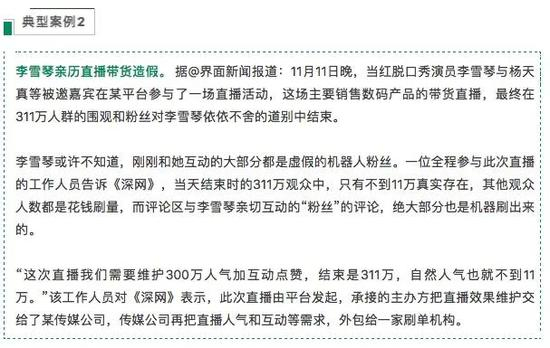 据腾讯《深网》报道,“一位全程参与此次直播的工作人员告诉《深网》,当天结束时311万的观众中,只有不到11万真实存在,其他观众人数都是花钱刷量,而评论区与李雪琴亲切互动的“粉丝”的评论,绝大部分也是机器刷出来的。”