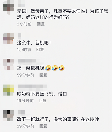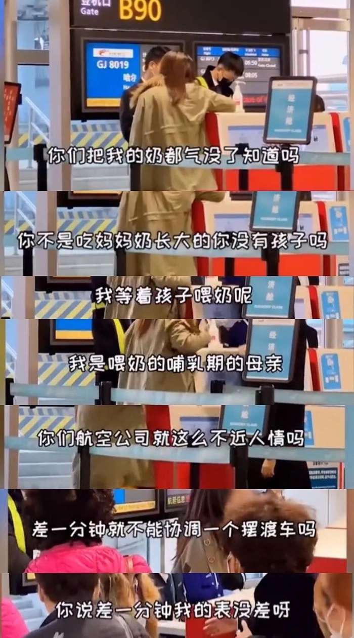 之后的情况就跟视频里的差不多。“她说,家里有个孩子等着喂奶,她是哺乳期的母亲,差一分钟就不能协调一个摆渡车吗?我们跟她反复解释,飞机上有100多名旅客,不可能因为她耽误其他旅客的行程,希望她能够理解,并告知有后续航班的话,可以乘坐。”