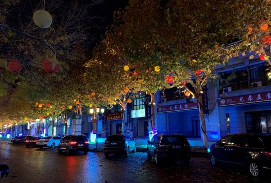 孔雀广场两旁的商业街上,挂满了ins风的彩色灯笼。