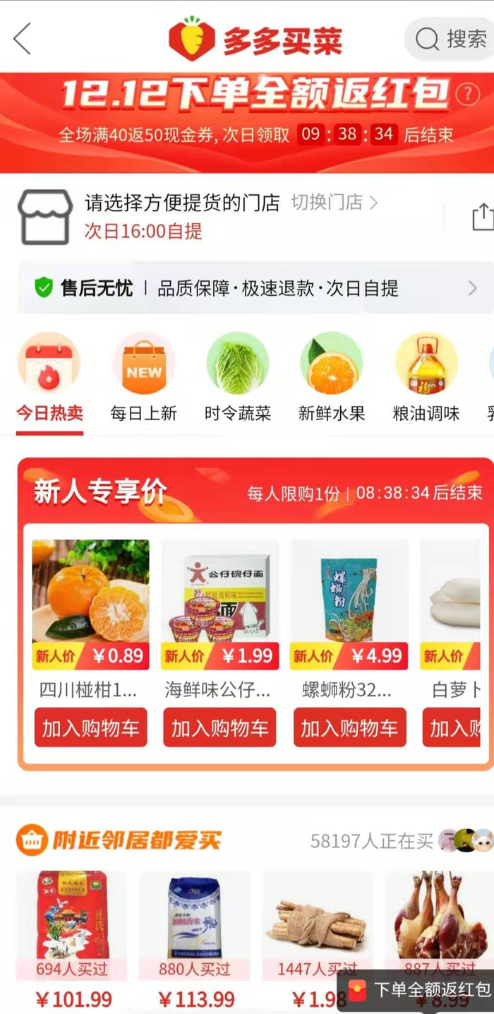 在盒马鲜生“优选”区,拼多多的多多买菜里,也在今天推出了双十二专场,通过购物红包、满减折扣等激励消费。