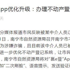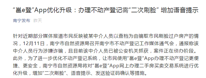 通报称该中介人员行为涉嫌诈骗,且目前该中介人员已被公安机关抓获,案件正在侦办阶段。此外,为了进一步优化不动产登记系统,让市民使用“邕e登”App办理不动产登记更便捷、更安全,南宁市自然资源局将对“邕e登”App网上办理二手房买卖交易系统进行优化升级,增加“二次刷脸”、语音提示、发送验证码确认等措施。