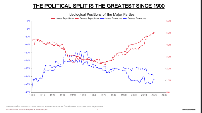 红线表明的是共和党,包括共和党的参议员、众议员,红色这条线就说明他们的保守主义达到了1920年以来最高的一个层次,蓝色说明的是自由主义者,他们属于民主党的众议员、参议员,所以不光是财富分化达到最大差距,政治上分化也达到了最大的分歧。美国在政治上、财富上有极大的一个分割,这是带来很大问题的一个地方。