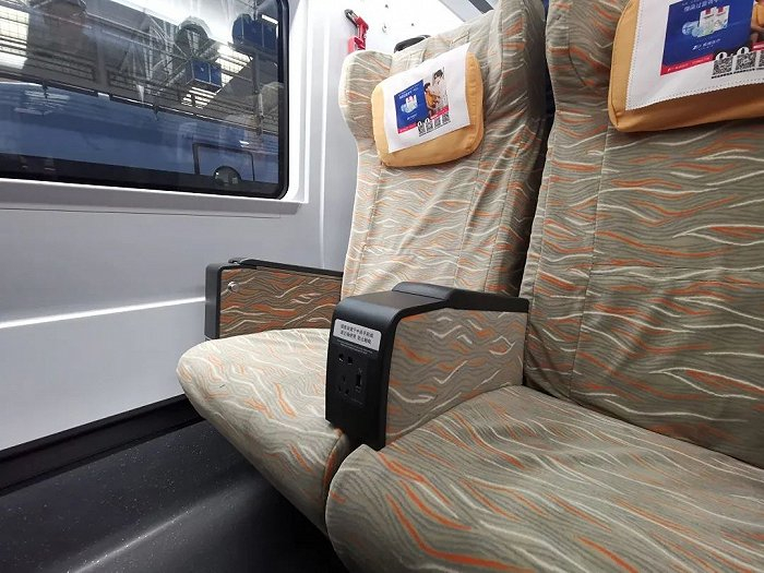 二等3人座椅的两坐垫之间设置了2个插座,每个插座面板集成1个三孔、1个两孔、1个USB口电源。