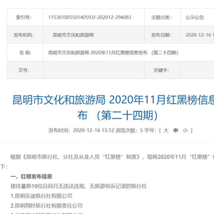 原标题:云南昆明公布11月份旅游“红黑榜” 1家旅行社经营许可证被吊销