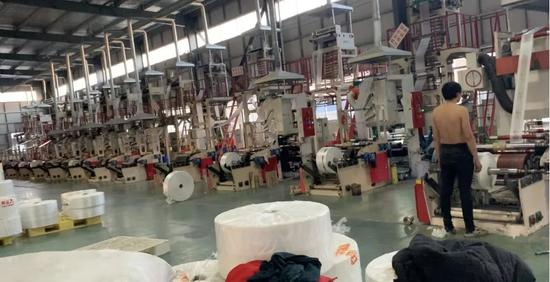 这些小作坊大都没有名字,周围的人习惯性地将其称之为“某某家的”,而且大多24小时轮班作业,即使到了华灯渐熄,整条街上商店开始打烊,不远处依旧能看到有商户灯火通明。他们有的将大门虚掩,不时传出机器轰鸣声,有的则干脆大门敞开,只留一个老人看守,一旁可见成捆的塑料薄膜和正在印染、切割、不停运转着的机器。