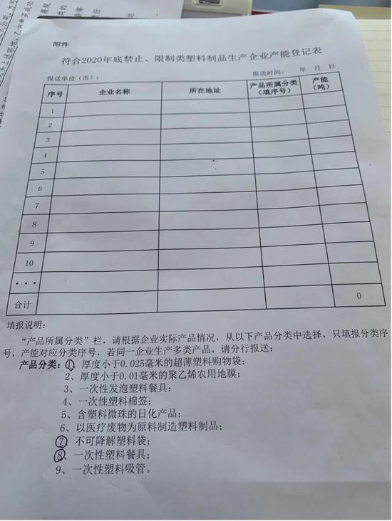 安徽省11月份下发的塑料制品企业登记表。开发区工作人员供图