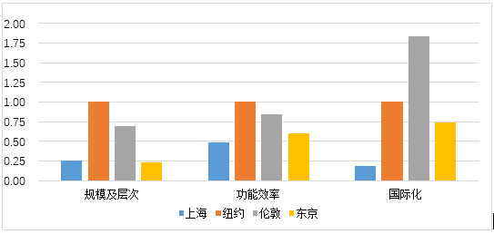 结合我们的评估体系,综合金融市场、中介和服务机构在规模、效率和国际化三个维度的分析,给出上海金融服务体系的综合得分,并与纽约、伦敦和东京进行比较,如图7所示。与纽约、伦敦和东京相比,上海在各个维度上都仍有很大的提升空间。上海在市场规模和层次方面与东京的距离相对较小,但在功能效率和国际化等方面还有相当的距离。