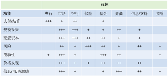 根据以上各类金融服务载体的金融功能,得出表1中的功能矩阵:其中每列代表一类载体(共八类),每行代表一种金融功能(共七种),加号数反映每类载体在发挥此项功能中的重要程度。