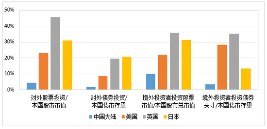 由于资本账户的管制,中国金融市场开放度与美国、英国和日本相比仍然较低,其制度、规则、监管都缺乏充分开放和国际化的特性。这些都反应在我国居民的全球资产配置程度非常低,海外投资者在中国的投资占比也很低,尤其是至今还没有境外公司在中国A股市场上市。(见图5)