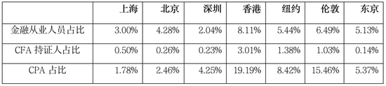 建立国际金融中心最为关键的一个因素是金融人才,尤其是高端人才的聚集。如表5所示,纽约、伦敦和香港金融从业人员的数量占所有从业人员之比远高于上海。而从金融人才的质量指标来看(如持有CFA证书的人数),上海也低于其它国际金融中心,略高于北京和深圳。真正熟悉国际运作的高端金融人才更是非常稀缺。