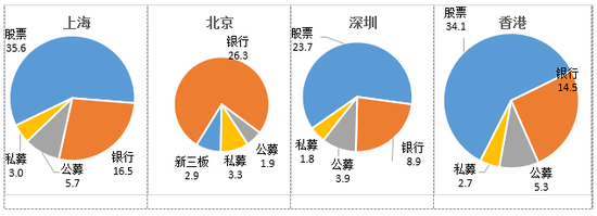 上海明显存在着银行独大的格局。上海的银行资产规模远高于纽约、伦敦和日本三个国际金融中心(约为纽约的2.3倍),反映了目前我国金融体系仍以银行为主导的现状。
