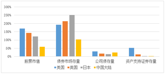 总体来说,我国的直接融资市场的比重相对较低。图3显示了美国、英国、日本和中国主要金融市场规模与GDP的比例,即使是相对比较发达的股市,我国的规模仅为美国的1/4,而我国的经济规模(以GDP计)约为美国的2/3。加之上海只占我国股市的一部分,而美国股市则主要集中在纽约,上海和纽约之间的差距会更大。在其它主要板块和层次方面,如公司债和证券化资产,两者之间的差距更为明显。