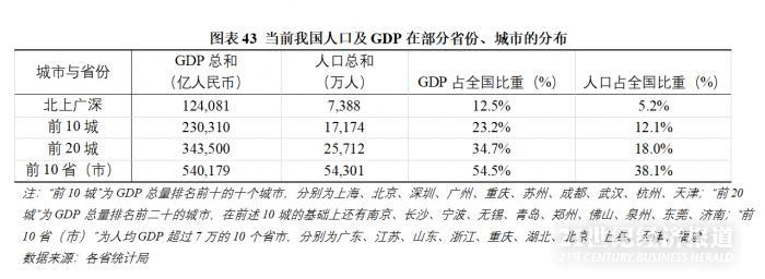 报告认为,当前中国人口地理分布与生产力布局的匹配程度依然滞后。比如北上广深为例,四地GDP占全国的12.5%,而人口仅占全国的5.2%。以全国10城和20城的GDP和人口占全国比重来看,人口占比落后经济比重分别达到11和16个百分点,经济地理再布局将是中国经济中长期发展的新增长点。