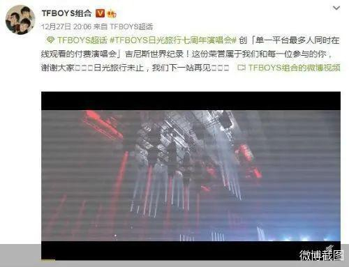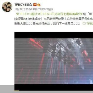 “TFBOYS七周年演唱会打破吉尼斯世界纪录,创‘单一平台最多人同时在线观看的付费演唱会’”,12月27日晚间,TFBOYS组合官方微博的发文,让线上演唱会市场的热度掀起一个小高潮。