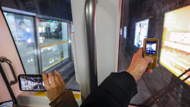 西部首条全自动运行地铁线路开通。12月18日,在成都轨道交通9号线无人驾驶列车的“开放式”驾驶室,一名老者(右)用手机拍摄地铁线路内部情景。新华社图