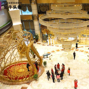 蜂巢酒店大堂以金色为主色调,中央立有四根白玉兰花柱