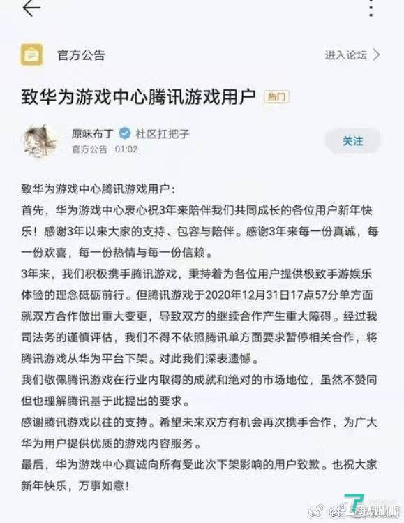 2021年1月1日凌晨1点,华为游戏中心APP发布《致华为游戏中心腾讯游戏用户》官方公告(以下简称“官方公告”),称不得不依照腾讯单方面要求暂停相关合作,将腾讯游戏从华为平台下架。