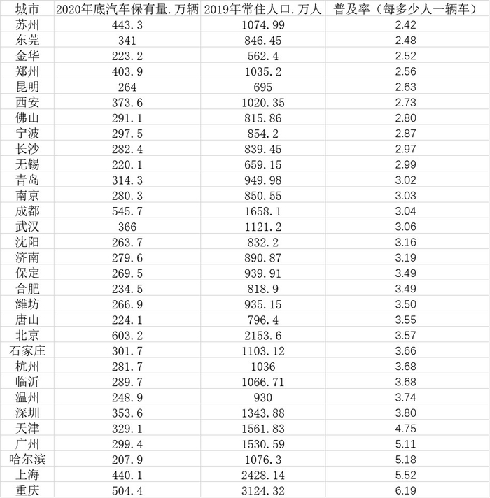 统计显示,31个汽车保有量超过200万辆的城市中,普及率最高的10个城市分别是苏州、东莞、金华、郑州、昆明、西安、佛山、宁波、长沙和无锡。这10个城市这一比值均低于3,也就是说这些城市不到3个人就拥有一辆车。